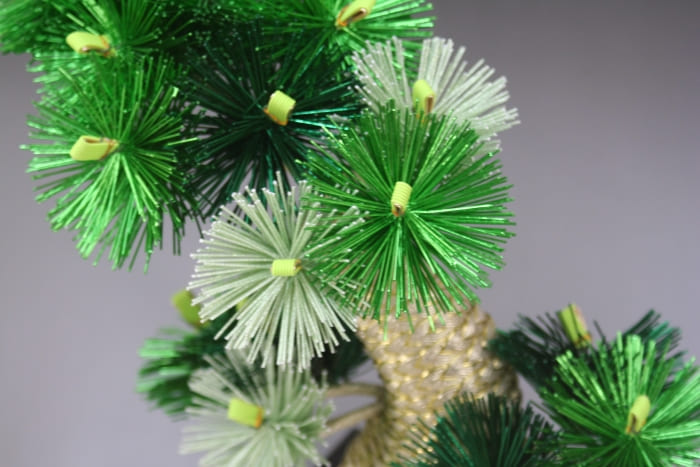 ただ金ばかりだと若干メリハリがないので、松葉の黄緑のものを一点だけ配置し、色つきのタイプだった竹と梅、白の鶴もうまく織り交ぜてアクセント的に配置しました。