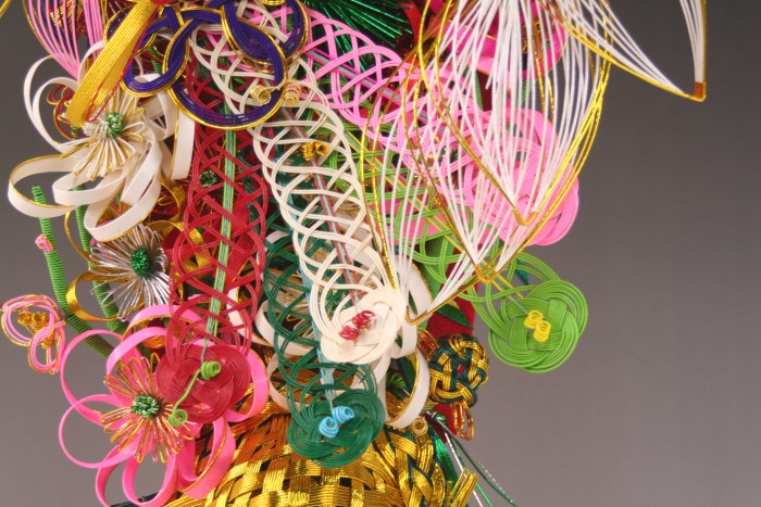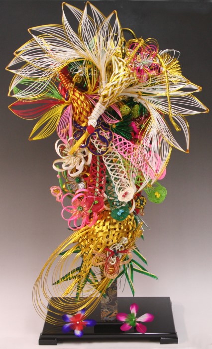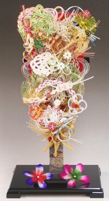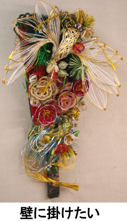 大きな塊の水引をからの羽子板リメイク![]() 鶴亀自体はそれほど大きいわけではありませんが大きな塊になった水引が複数ありそれらをどう配置するかがポイント。 |